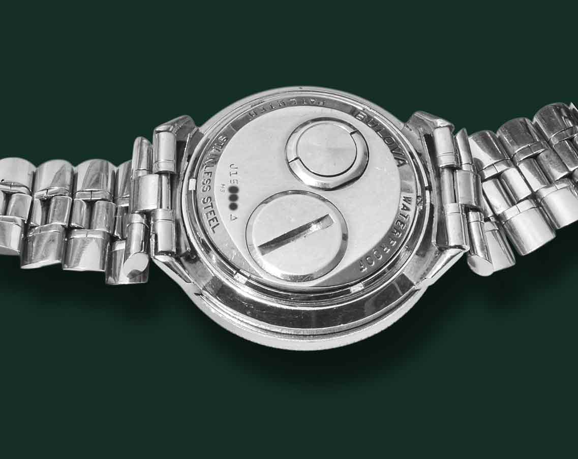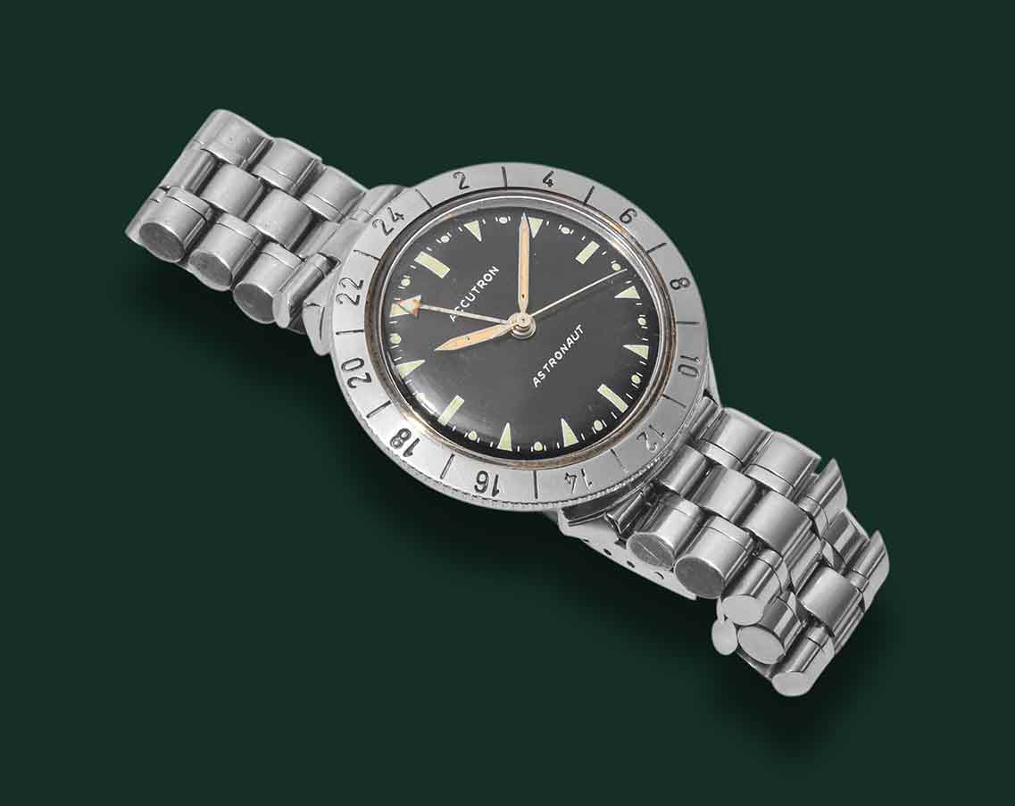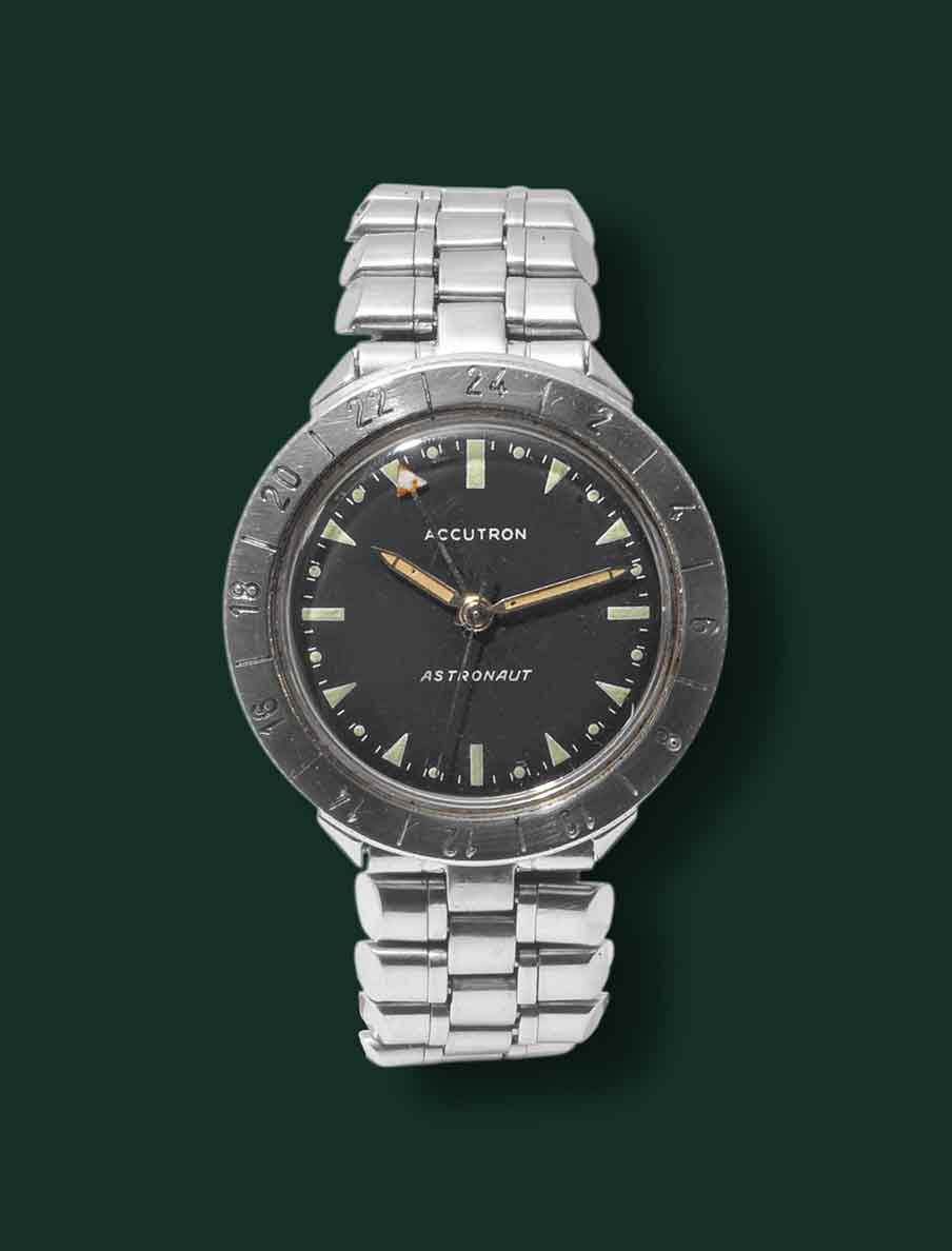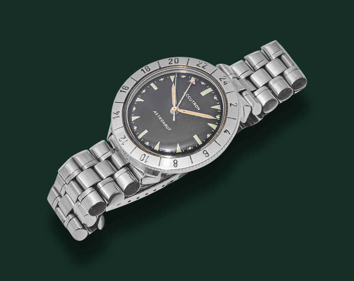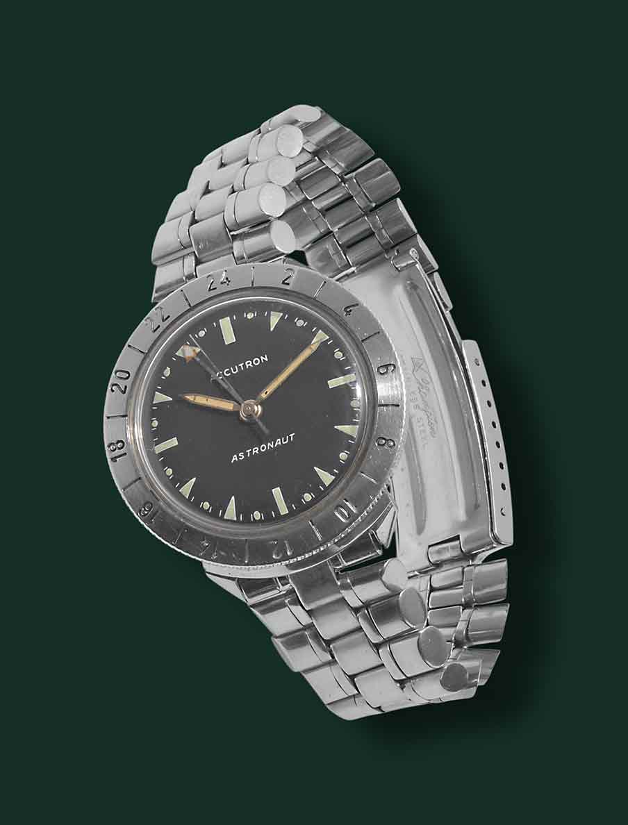 Bulova Accutron Austronaut, M3, anno 1968 circa, cassa in acciaio con diametro 38mm, vetro esalite quadrante nero con indici al trizio, funzione GMT, movimento al quarzo Bulova Accutron, bracciale in acciaio originale Bulova, orologio corredato da nostra scatola e garanzia