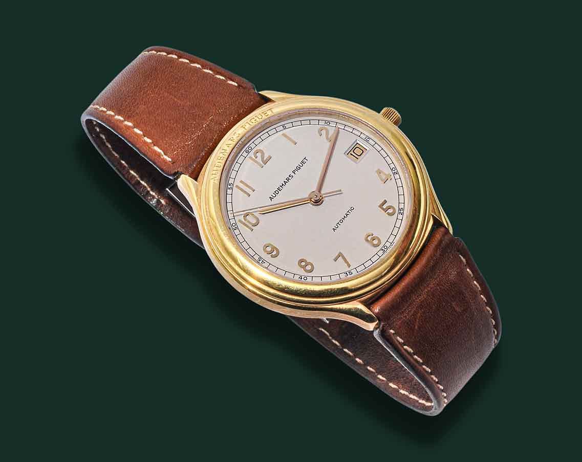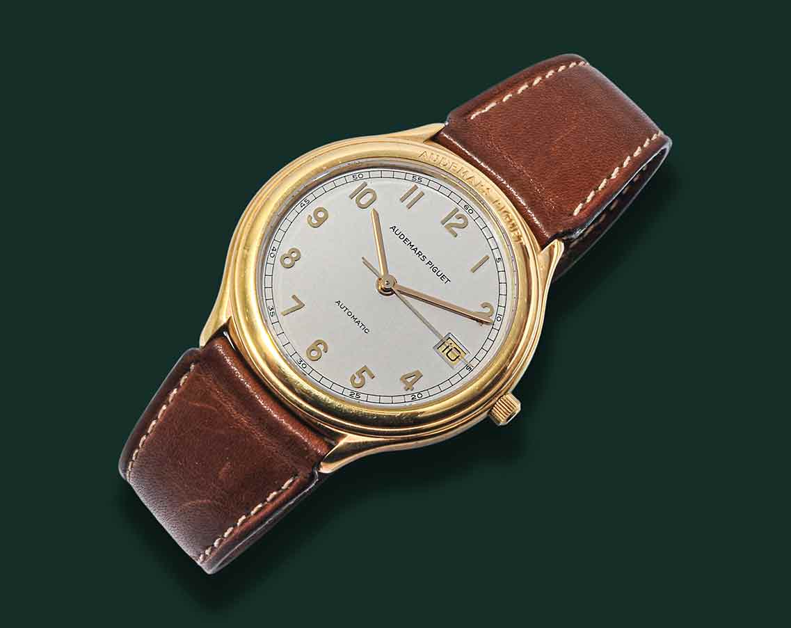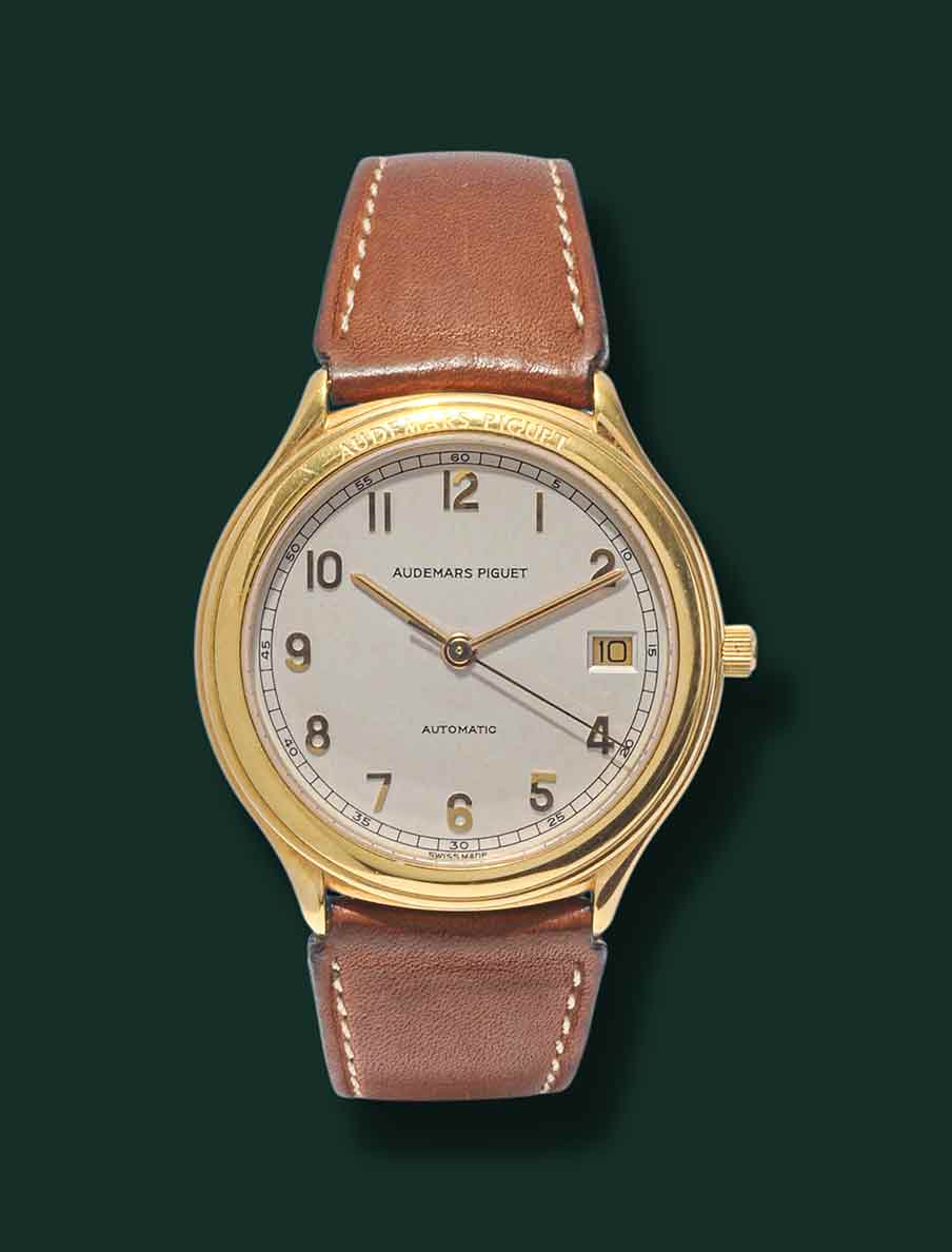 Audemars Piguet Huitième, anni’90, cassa in oro giallo 18Kt con diametro 36mm, vetro zaffiro, quadrante bianco con numeri arabi in oro applicati e minuteria serigrafia, datario a ore 3, movimento automatico Audemar Piguet calibro 2124, cinturino in pelle con doppia chiusura deployante a farfalla AP, orologio corredato con nostra scatola e garanzia.