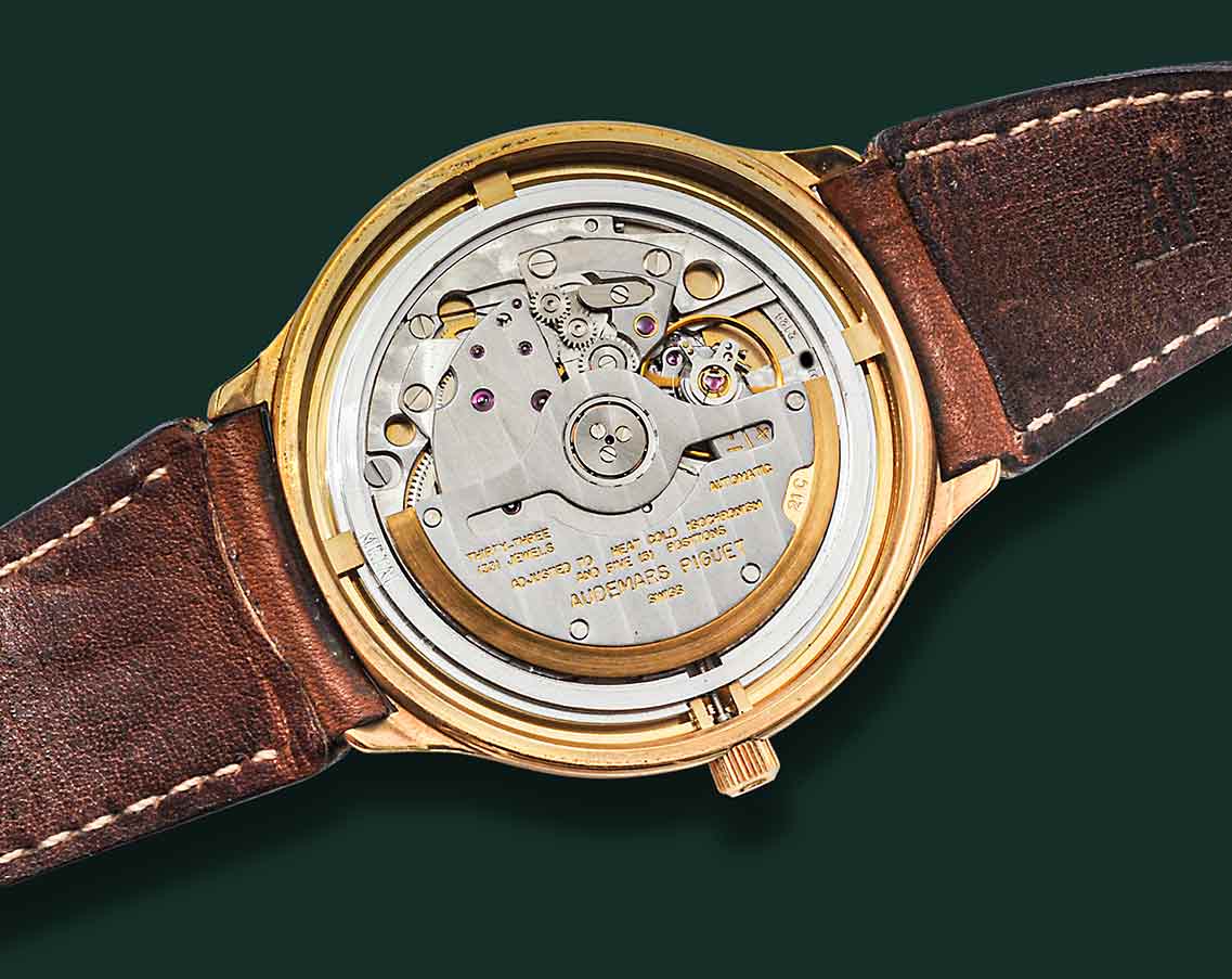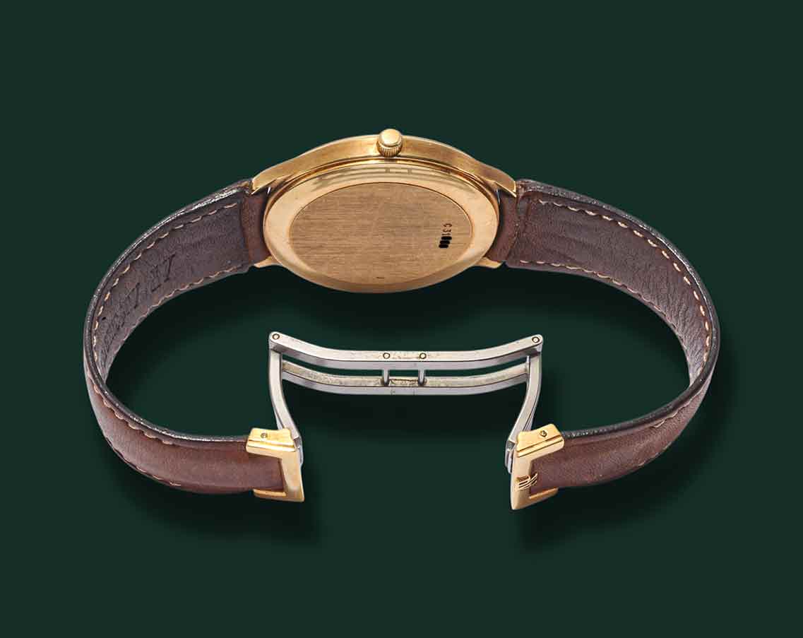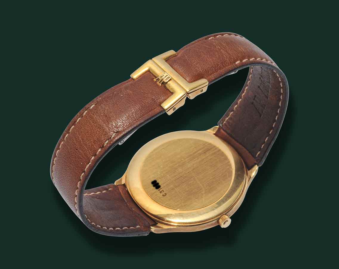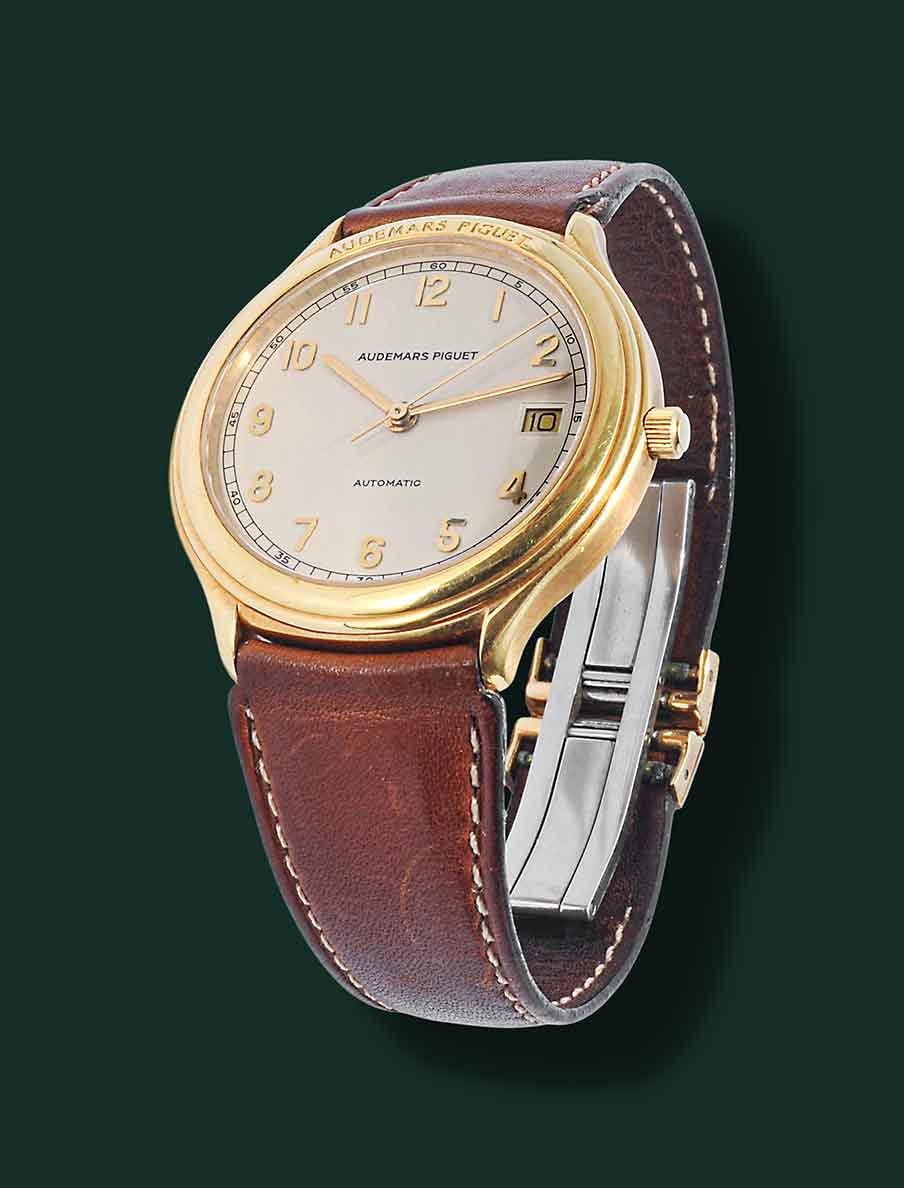 Audemars Piguet Huitième, anni’90, cassa in oro giallo 18Kt con diametro 36mm, vetro zaffiro, quadrante bianco con numeri arabi in oro applicati e minuteria serigrafia, datario a ore 3, movimento automatico Audemar Piguet calibro 2124, cinturino in pelle con doppia chiusura deployante a farfalla AP, orologio corredato con nostra scatola e garanzia.