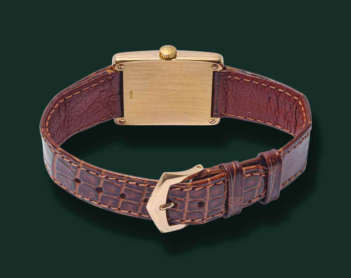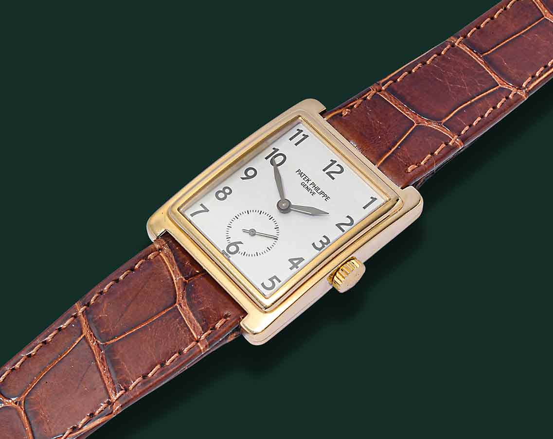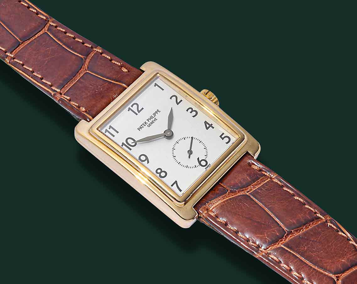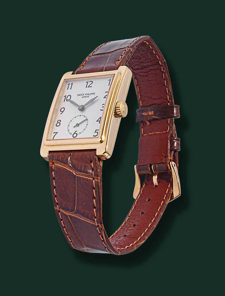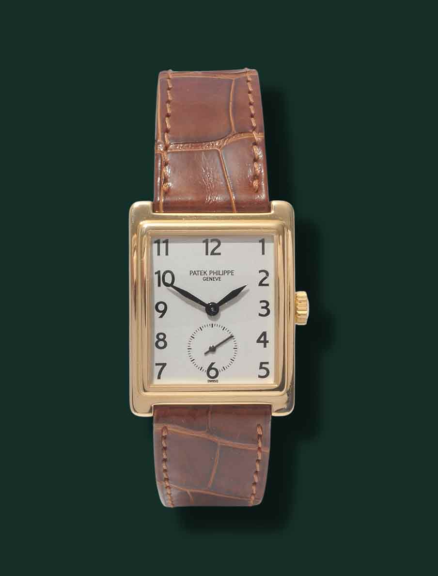Patek Philippe Gondolo, referenza 5010, anni ’90, cassa rettangolare in oro giallo 18Kt con diametro 25.5X32.5mm, vetro zaffiro quadrante bianco con indici serigrafati e secondi al 6, movimento meccanico a carica manuale calibro Patek Philippe 215, cinturino in pelle con fibbia originale PateK Philippe, orologio corredato da nostra scatola e garanzia.
