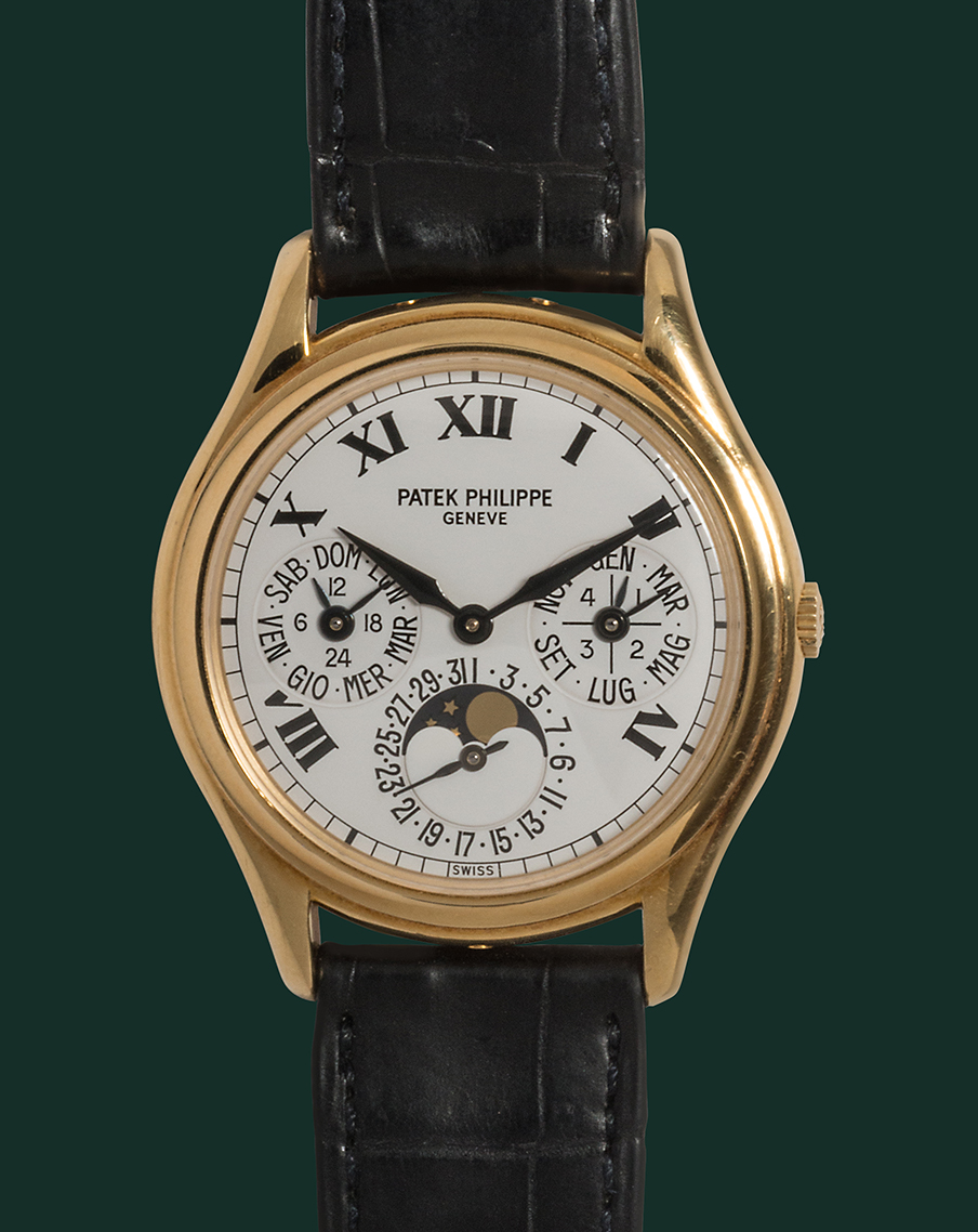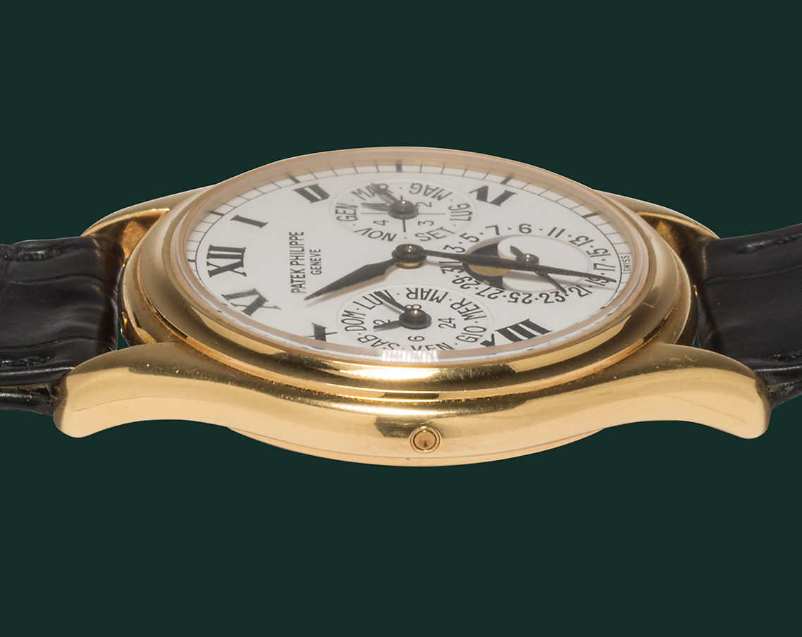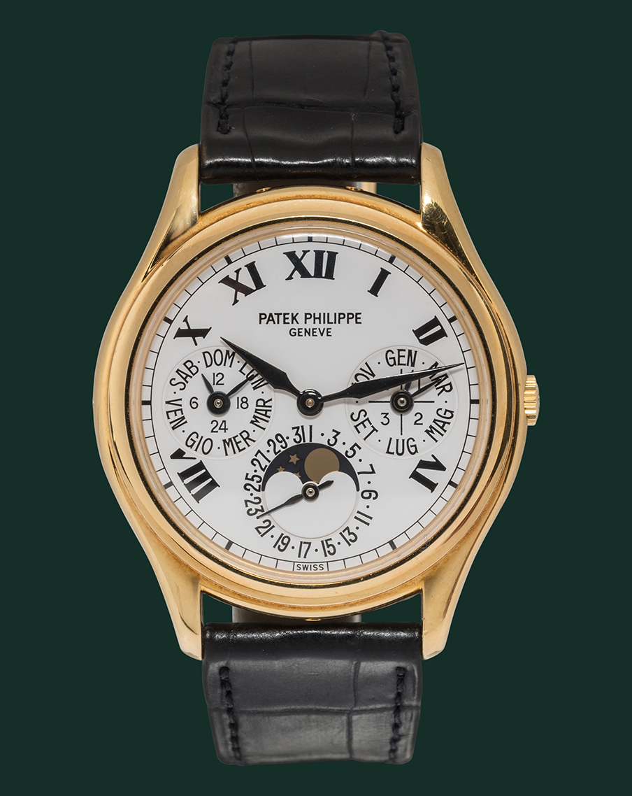 PATEK PHILIPPE Ref. 3940 Home Orologi Patek philippe, automatic, year 2000, double case back, 18 Kt yellow gold, moon phases, date, days of the week, months and perpetual calendar. 36 mm case, crocodile strap, including warranty. Price: on request
