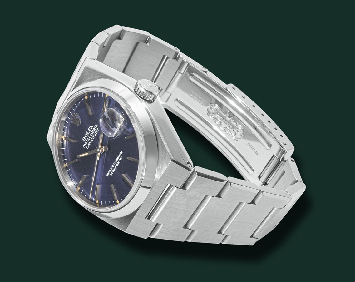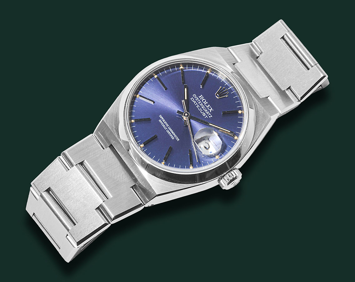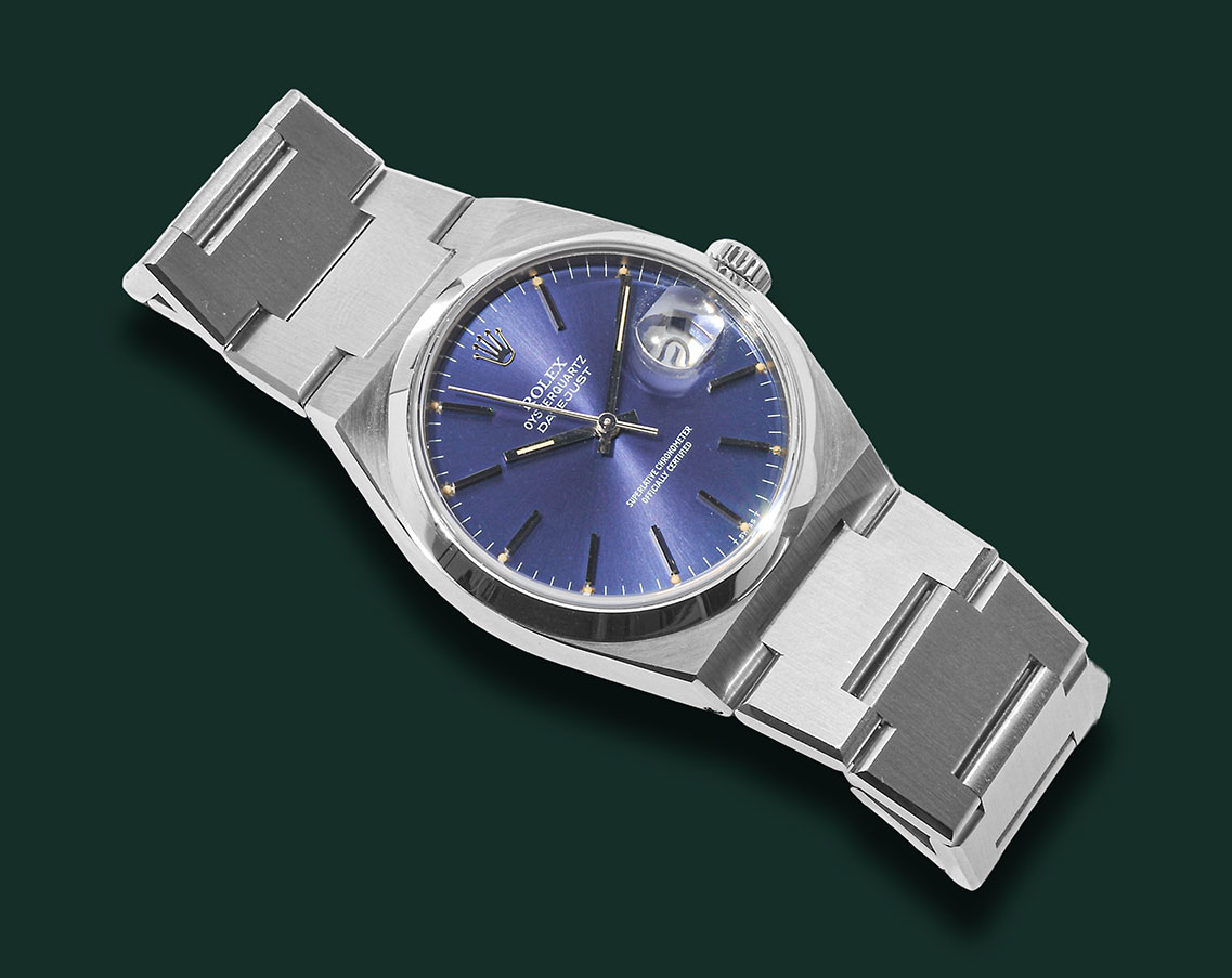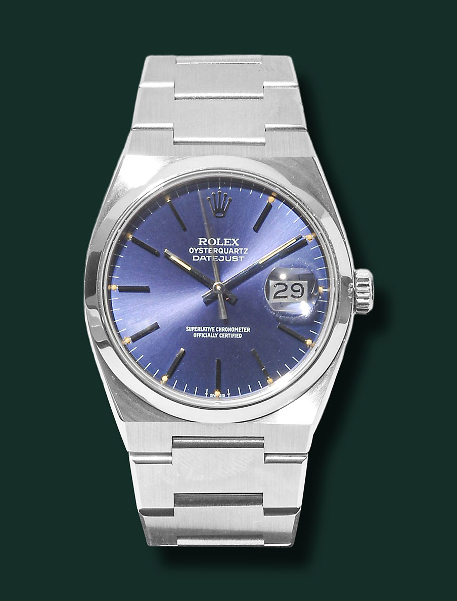 Rolex Oysterquartz Datejust, referenza 17000B, anno 1982, cassa in acciaio con diametro 36mm, movimento elettromeccanico al quarzo calibro Rolex 5035, vetro zaffiro, quadrante blu con riflessi viola, bracciale in acciaio Oyster, orologio in ottime condizioni, corredato da nostra scatola e garanzia.