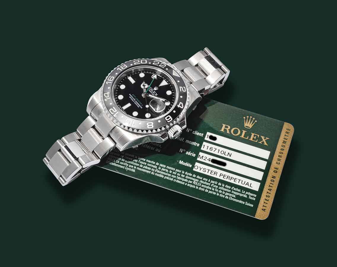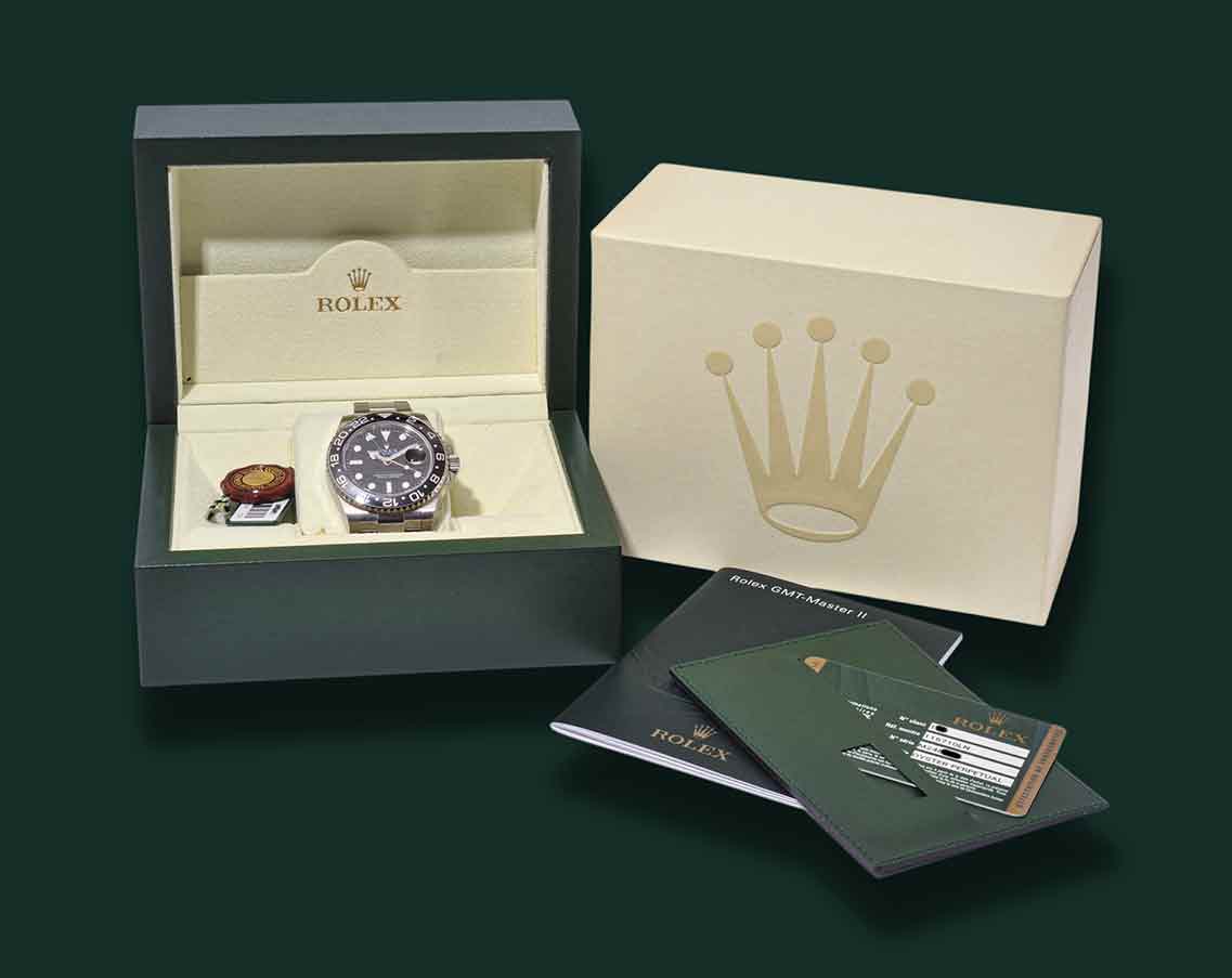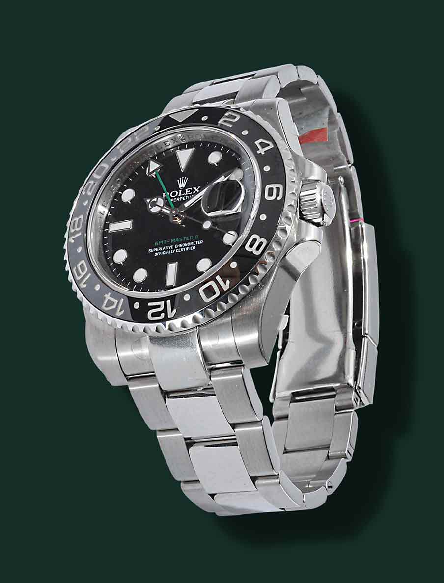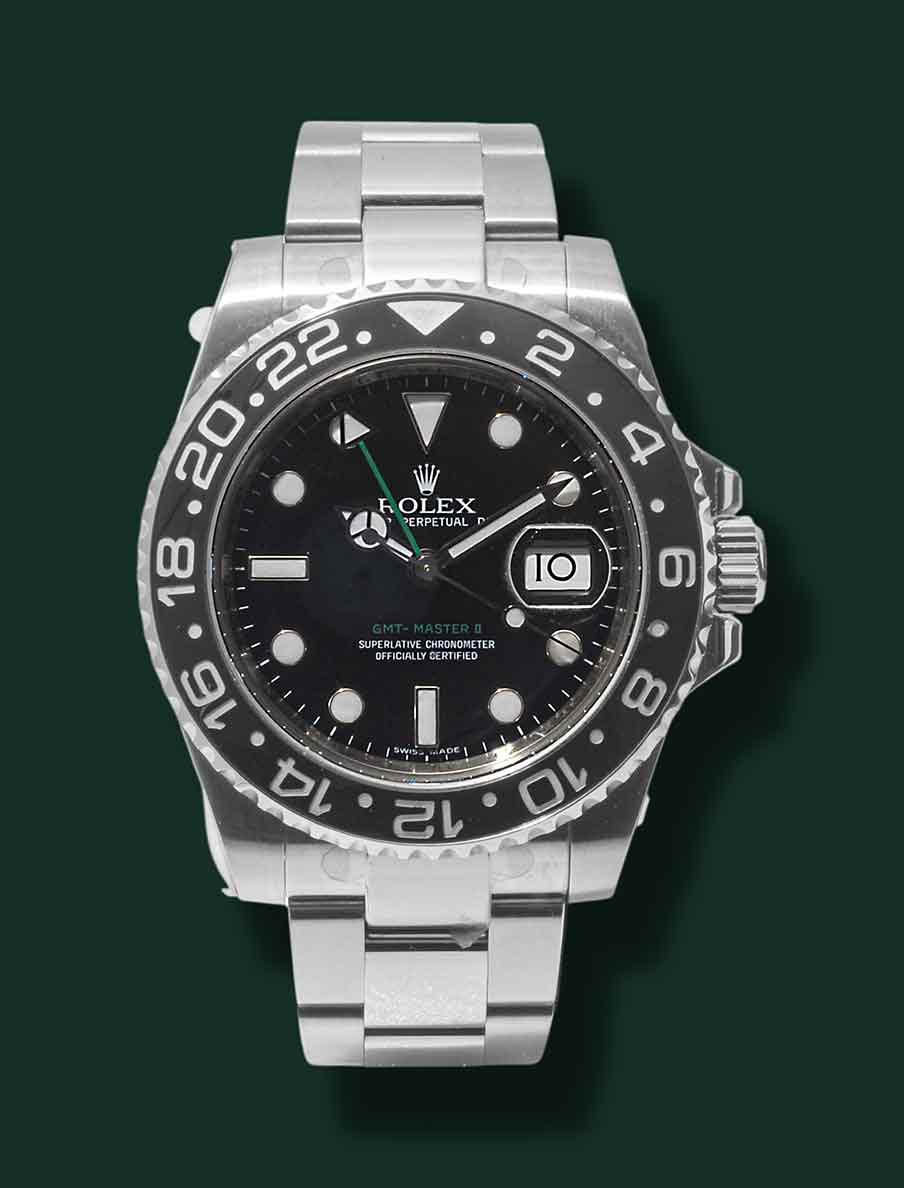 Rolex GMT – Master II NOS, Referenza 116710 LN, anno 2007, cassa in acciaio con diametro 40mm, vetro zaffiro, ghiera nera ceramica, quadrante nero con indici bicchierini, freccino GMT verde, movimento meccanico a carica automatica calibro Rolex 3186, bracciale Oyster in acciaio, orologio NOS corredato da scatola e garanzia originale Rolex.