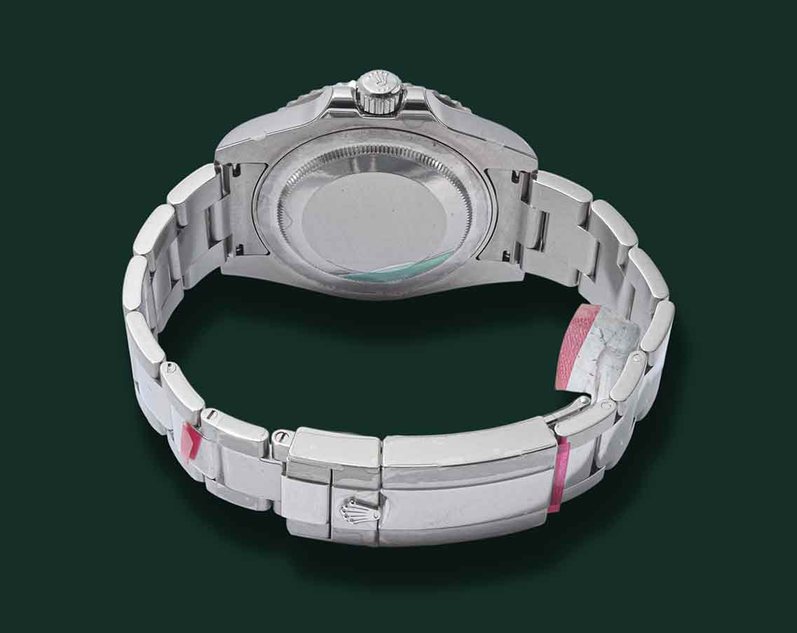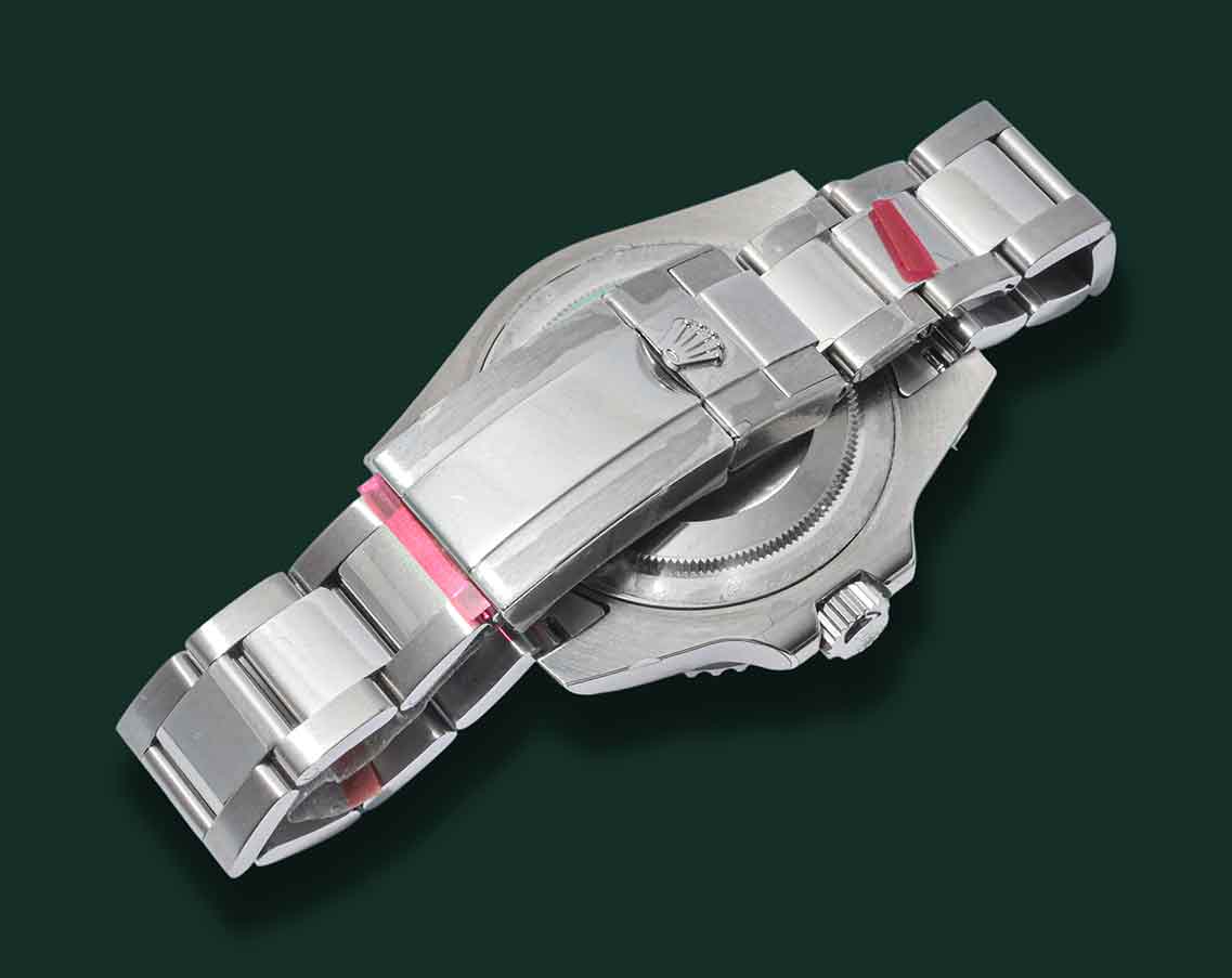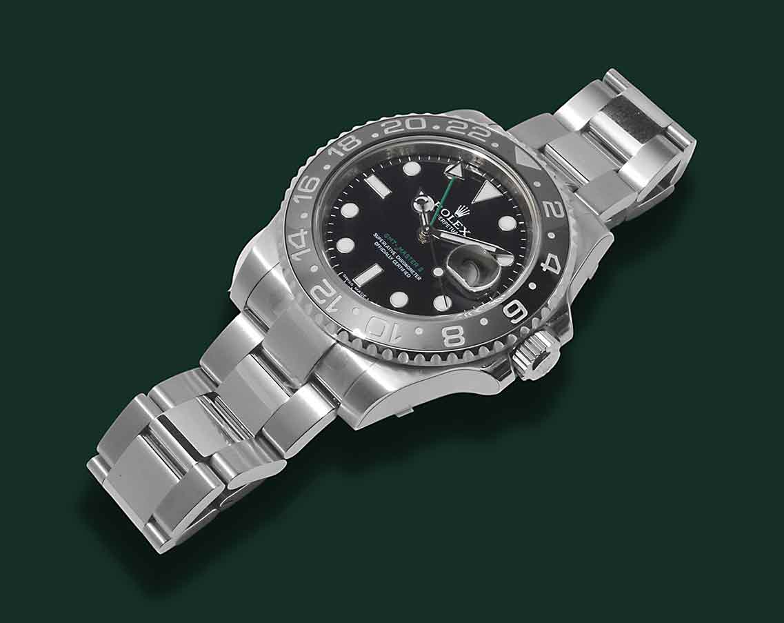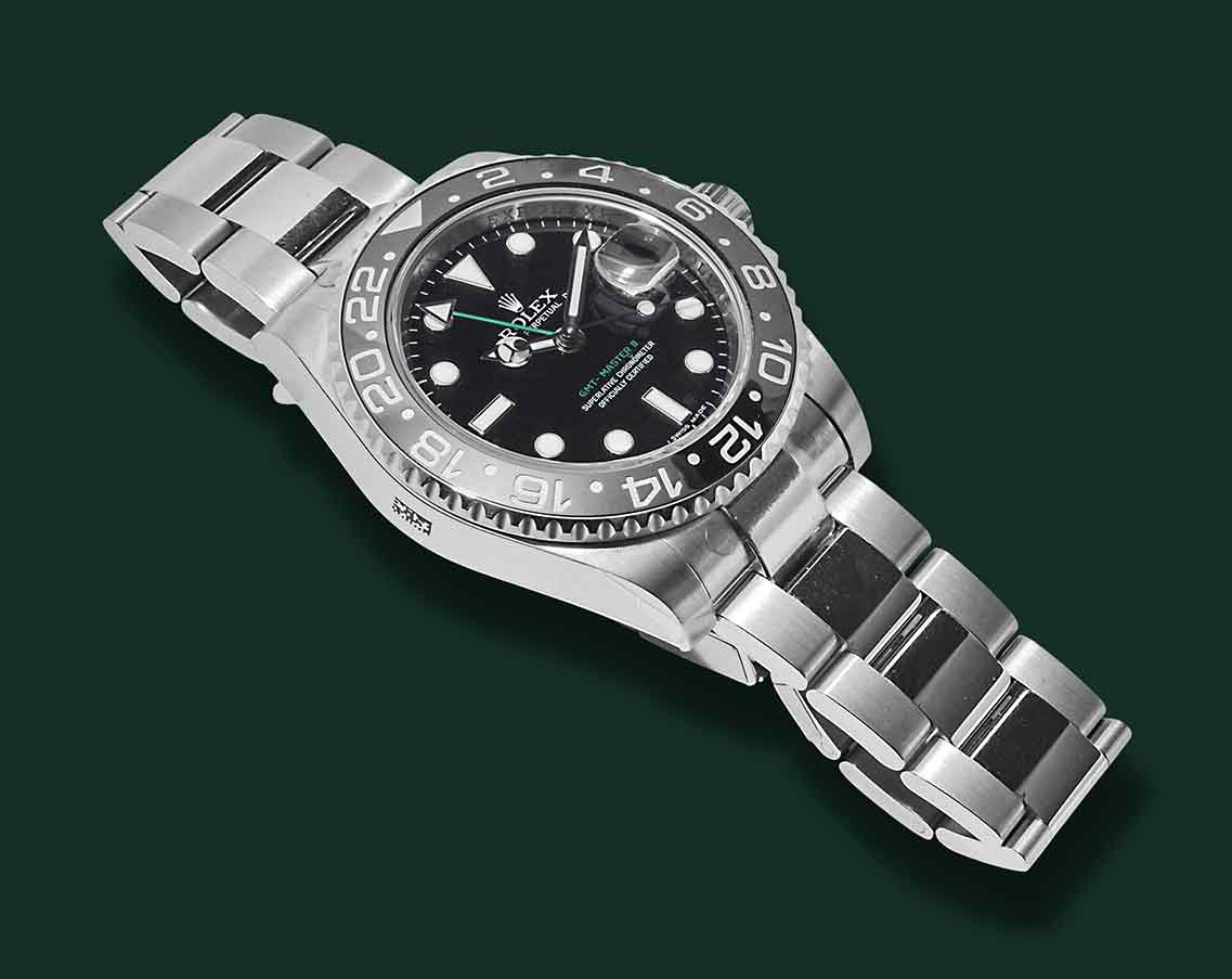 Rolex GMT – Master II NOS, Referenza 116710 LN, anno 2007, cassa in acciaio con diametro 40mm, vetro zaffiro, ghiera nera ceramica, quadrante nero con indici bicchierini, freccino GMT verde, movimento meccanico a carica automatica calibro Rolex 3186, bracciale Oyster in acciaio, orologio NOS corredato da scatola e garanzia originale Rolex.