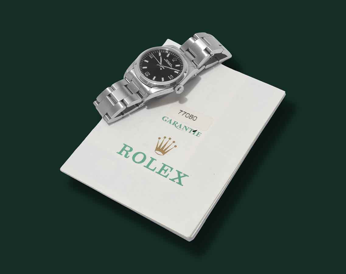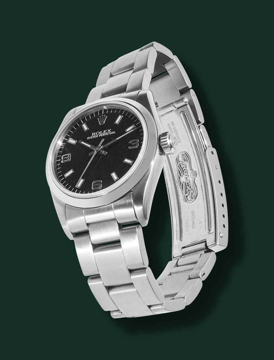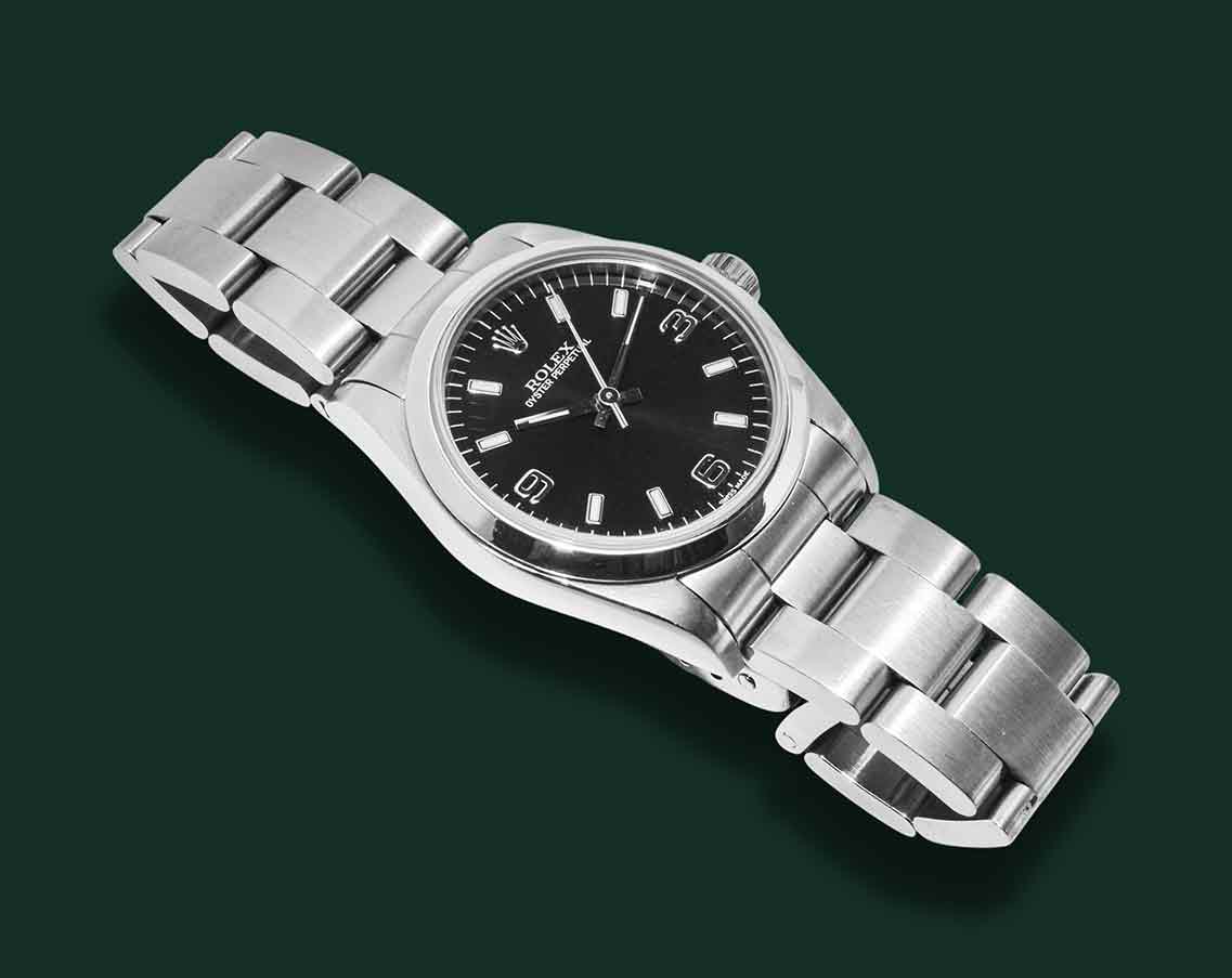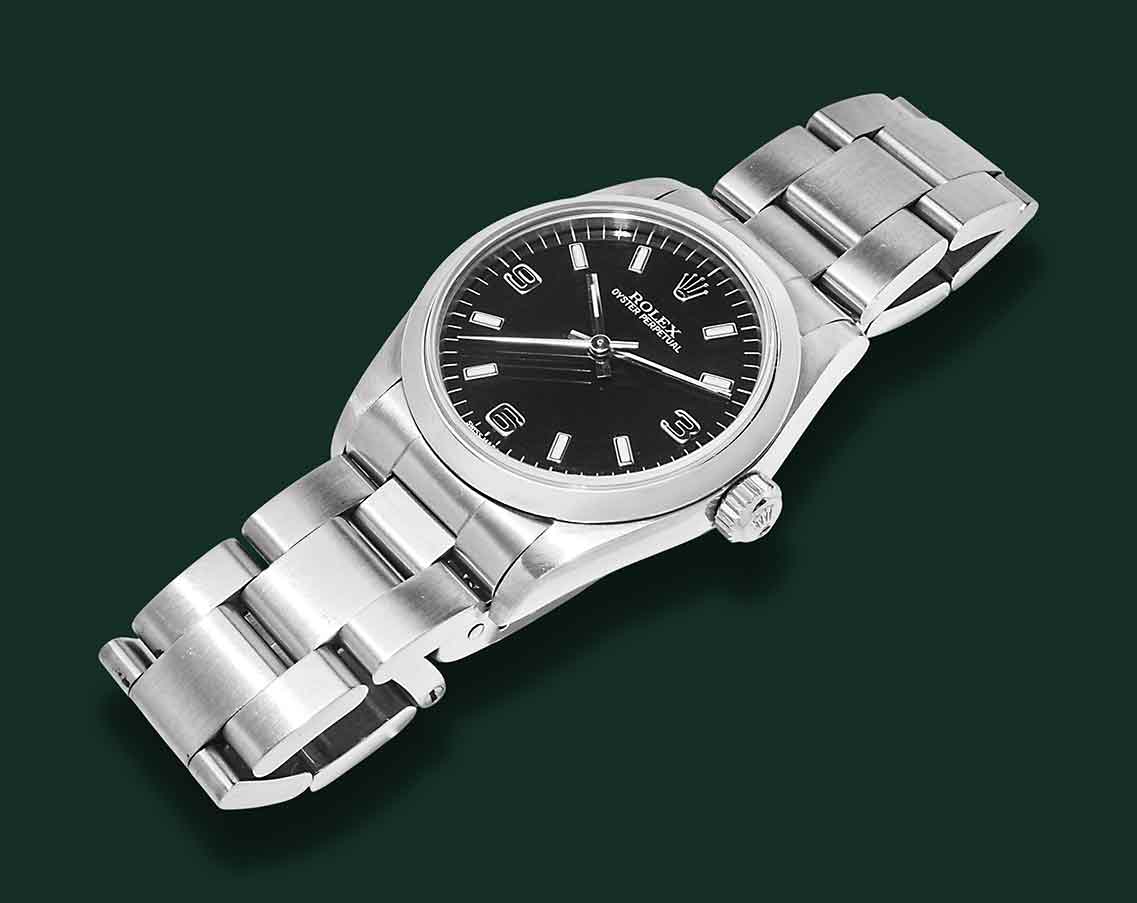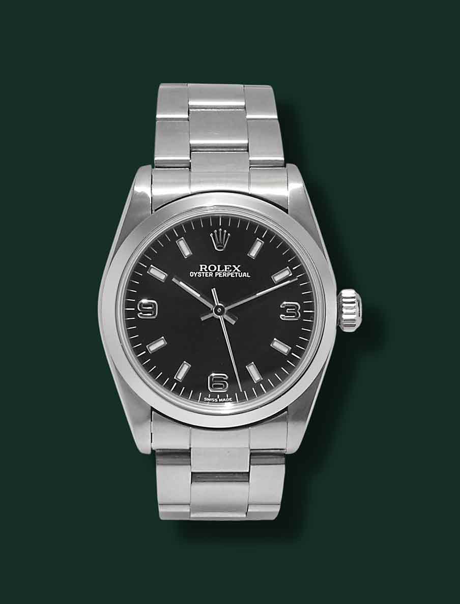 Rolex Oyster Perpetual, referenza 77080, anno 2000, cassa in acciaio con diametro 31mm, vetro zaffiro, quadrante nero con indici applicati e numeri arabi tipologia Explorer 3,6,9, movimento meccanico a carica automatica calibro Rolex 2230, bracciale Oyster in acciaio, orologio corredato da scatola e garanzia originale Rolex
