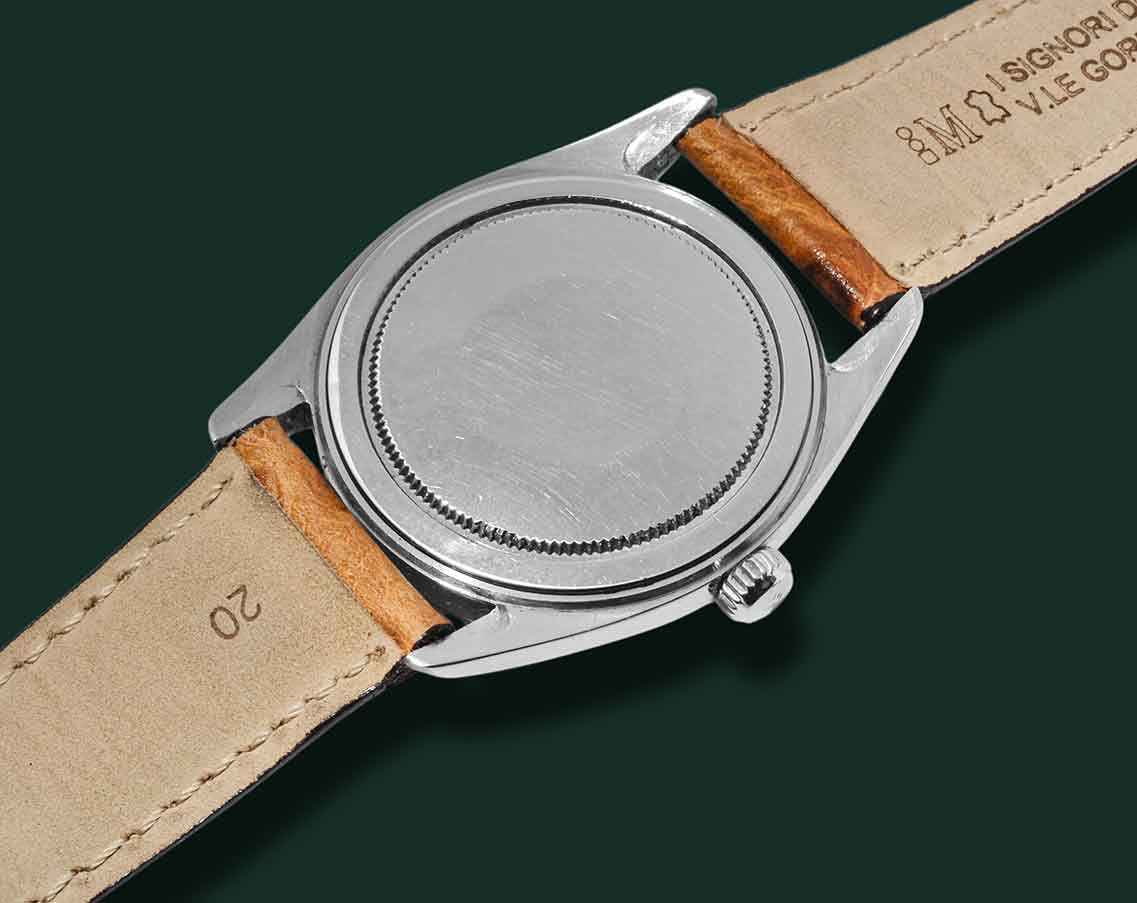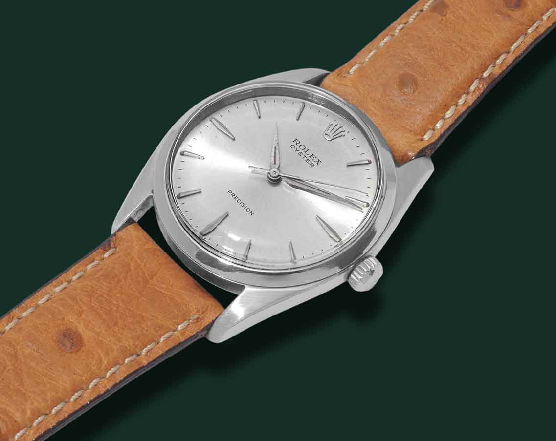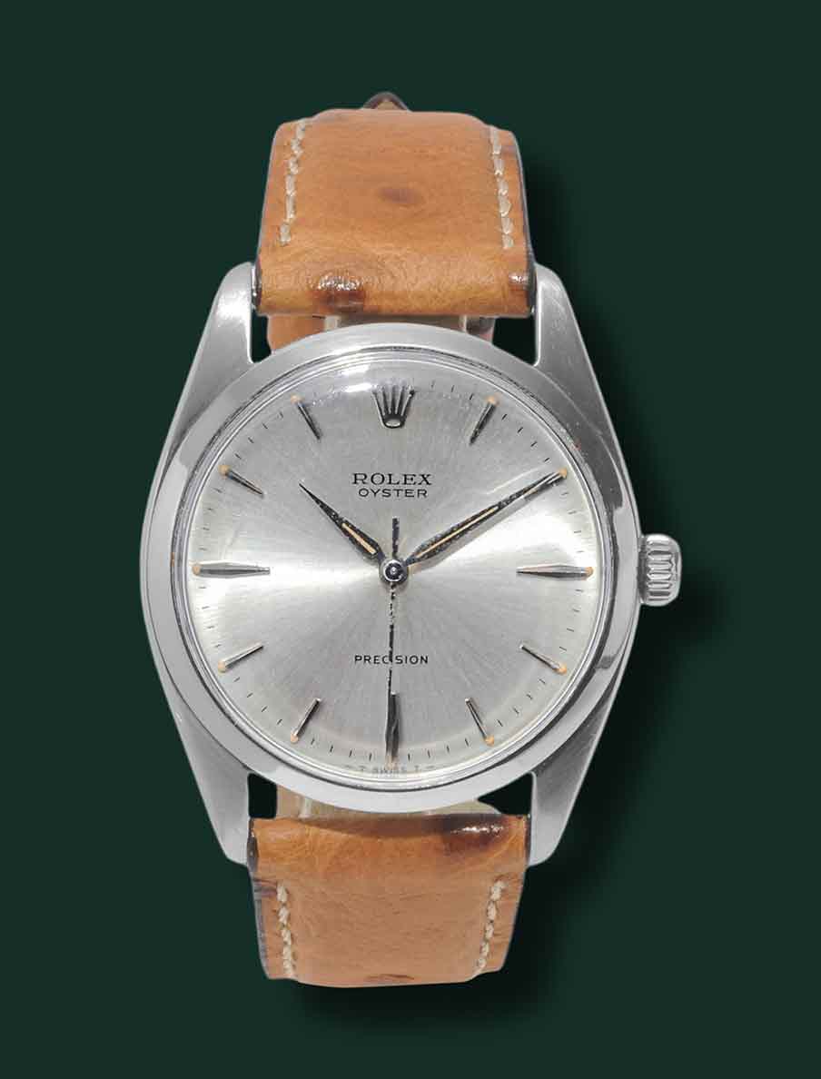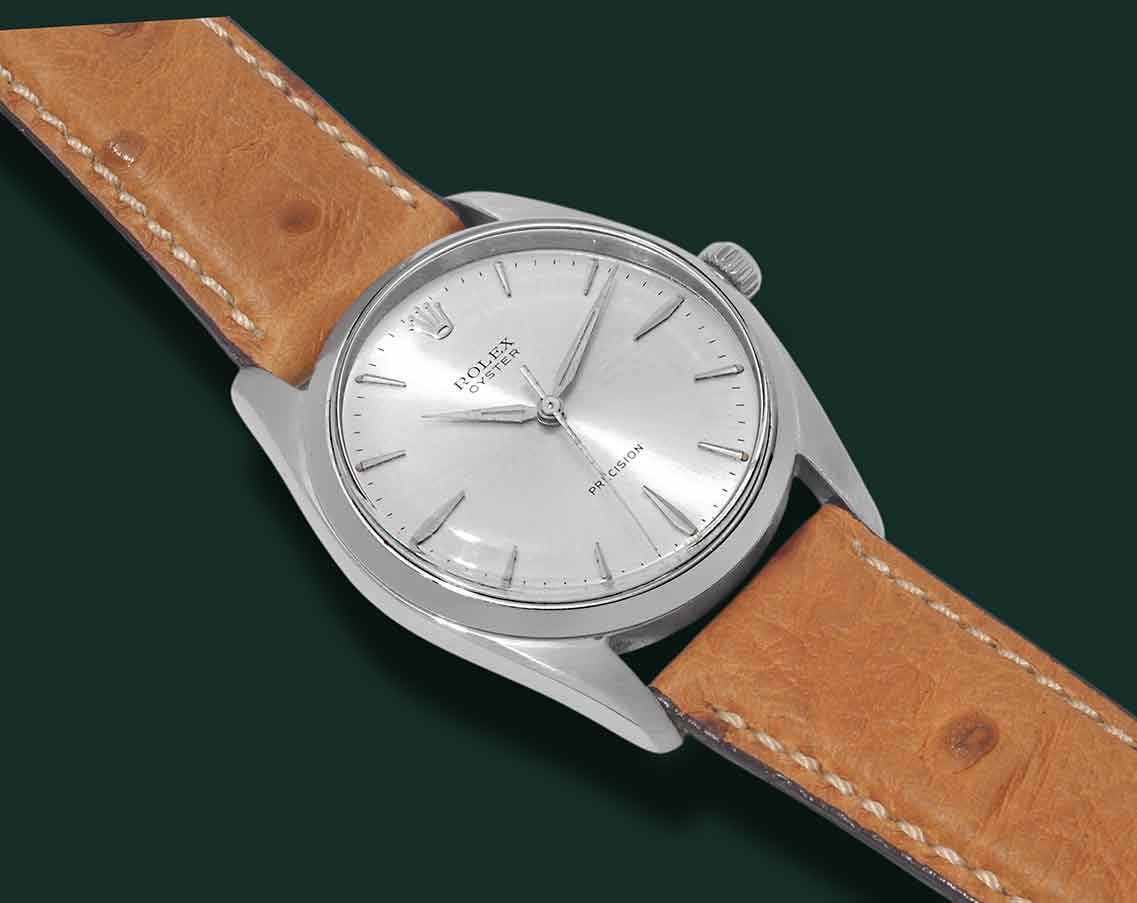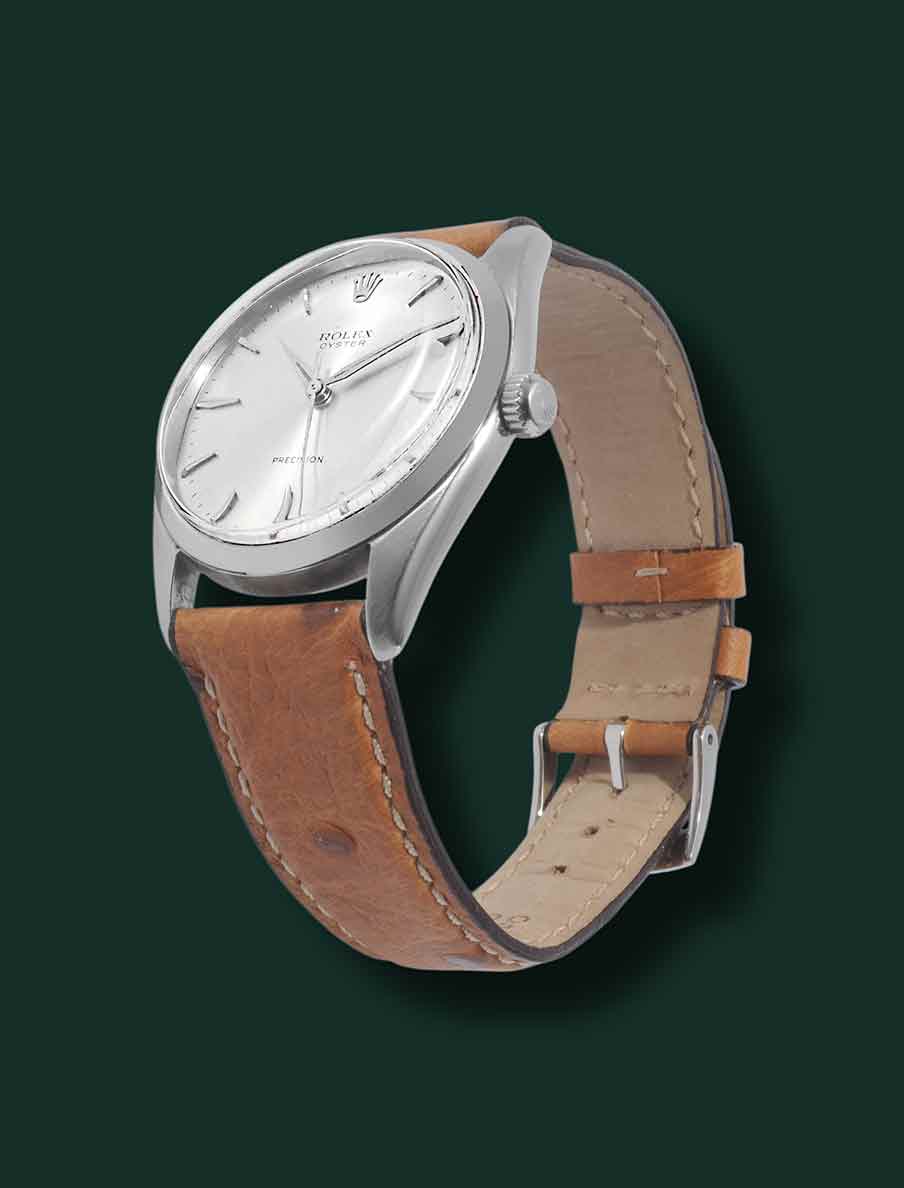 Rolex Oyster Precision Jumbo, referenza 6424, anno 1965, cassa in acciaio con diametro 36mm, vetro esalite, quadrante argentè con indici applicati, movimento a carica manuale calibro Rolex 1215, cinturino in struzzo, fibbia Rolex, orologio corredato da nostra scatola e garanzia