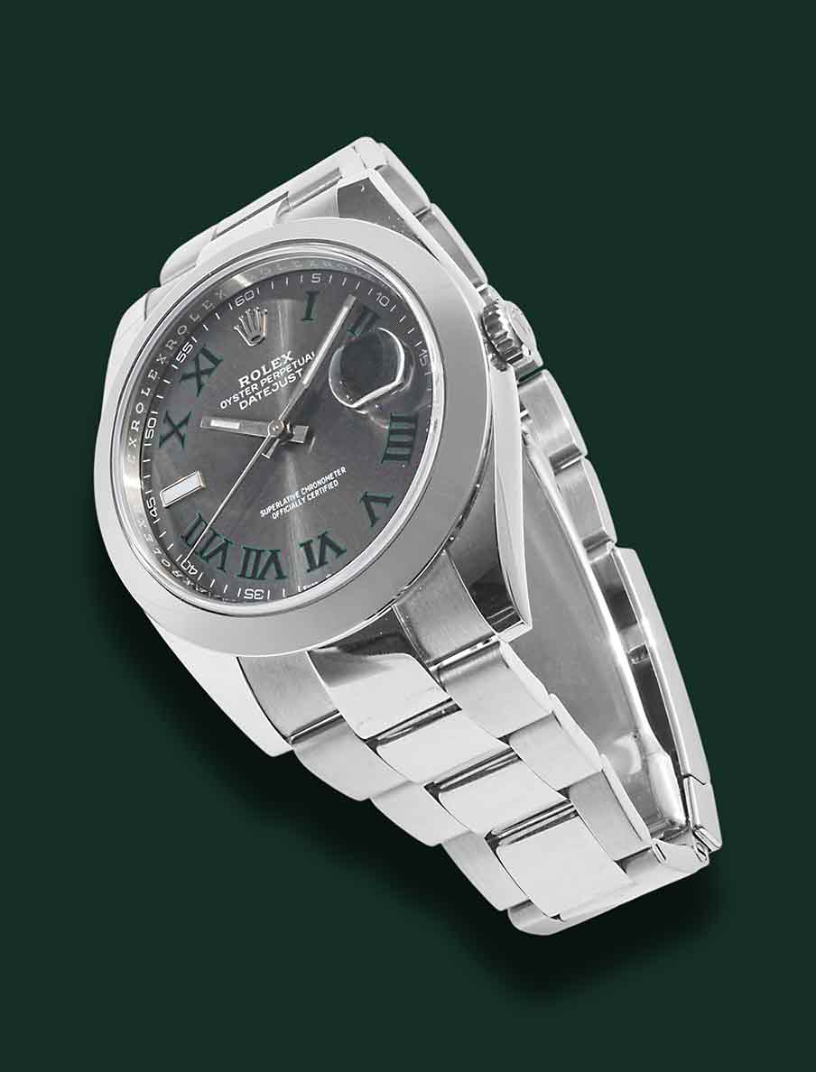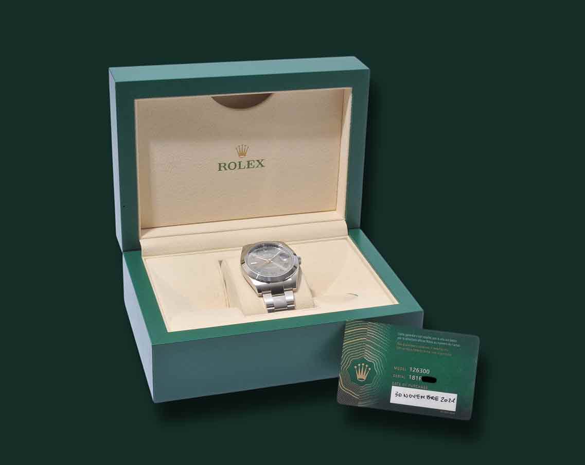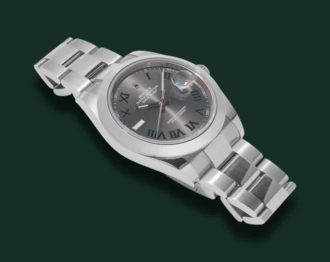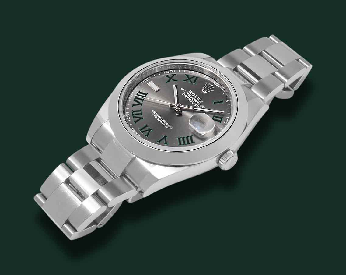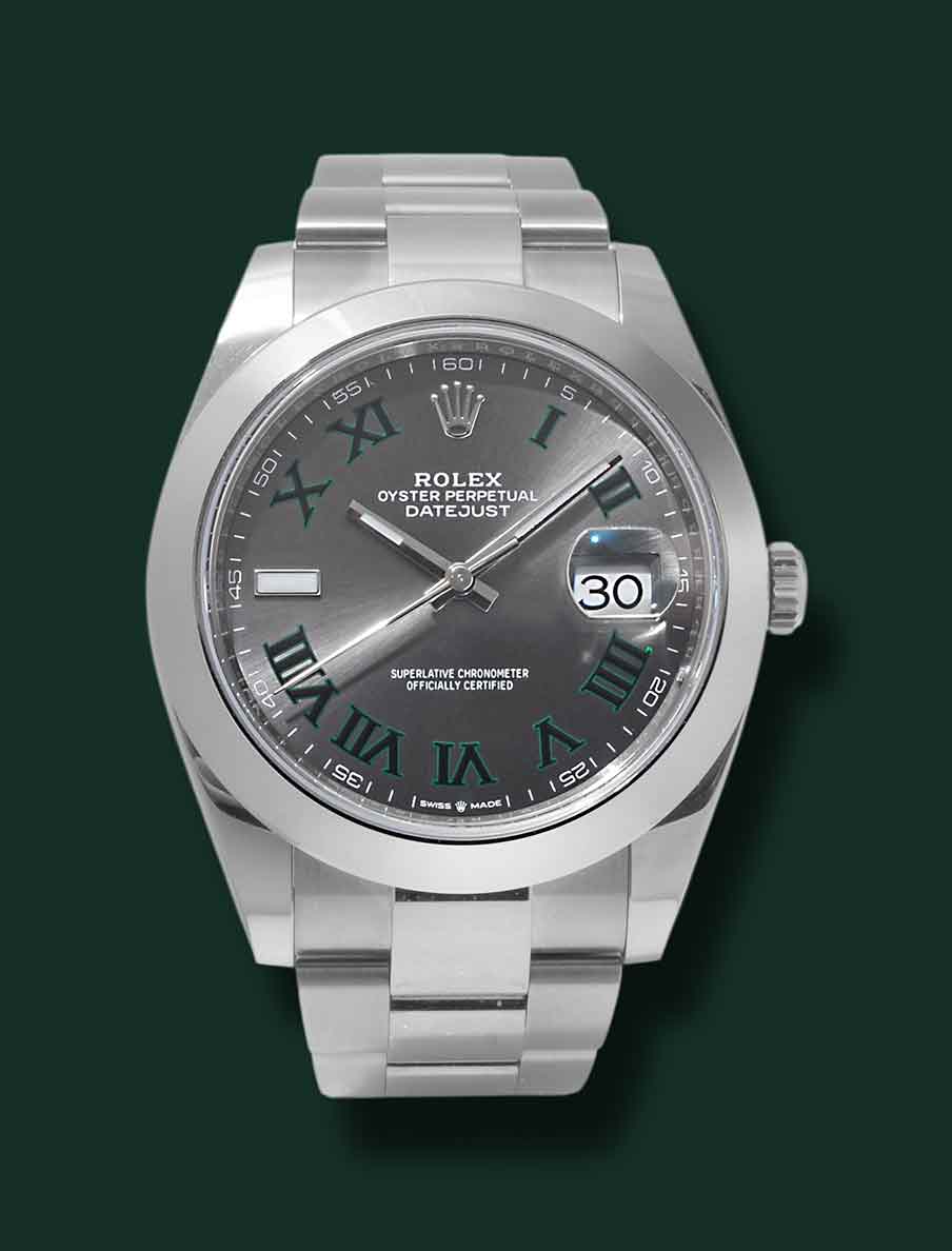 Rolex DateJust Wimbledon, referenza 126300, anno 2021, cassa in acciaio con diametro 41mm, vetro zaffiro, quadrante grigio con numeri romani verdi indice applicato a ore 9,e datario a ore 3, movimento automatico calibro Rolex 3235, bracciale Oyster in acciaio, orologio corredato da scatola e garanzia originale Rolex.